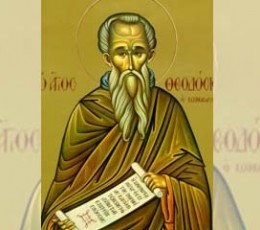 Teodósio, cujo nome significa "um presente de Deus", nasceu na Capadócia em 423, de pais ricos, nobres e cristãos. Recebeu uma boa e sólida formação dentro dos preceitos da fé católica. Um dia, lendo a história de Abraão, identificou-se com ele e decidiu sair de sua terra em busca de Deus. Peregrinou para a terra santa.
